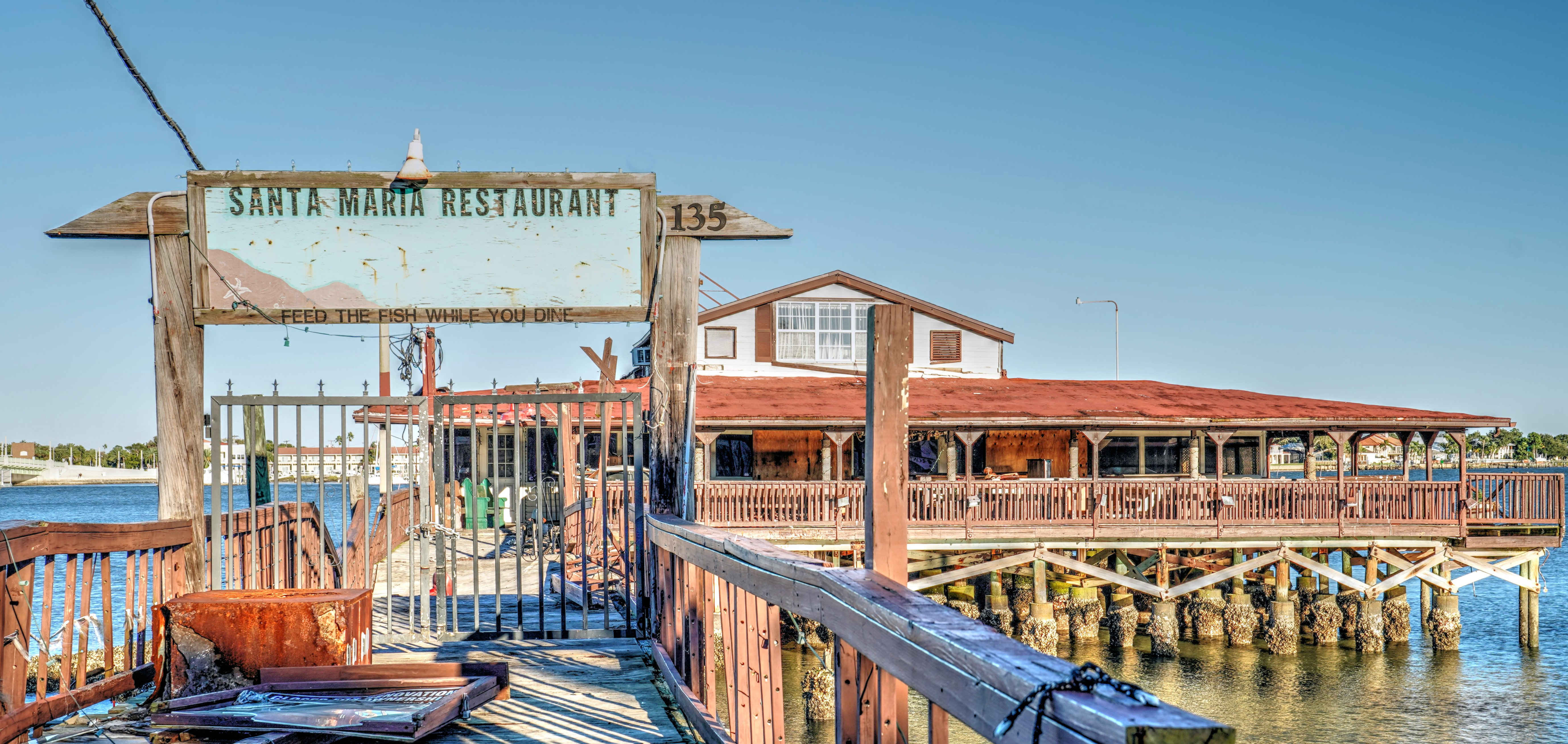 The Santa Maria Restaurant opened in the ’40’s on St. Augustine’s waterfront, next to the popular downtown. In 2015 it was sold and closed down. An ongoing battle between the new owners and the city left the once popular landmark desolate and abandoned. The hurricanes and storms have not been kind, causing more damage with each passing year. The big sign on the roof is gone and the walkway to the building is collapsing.